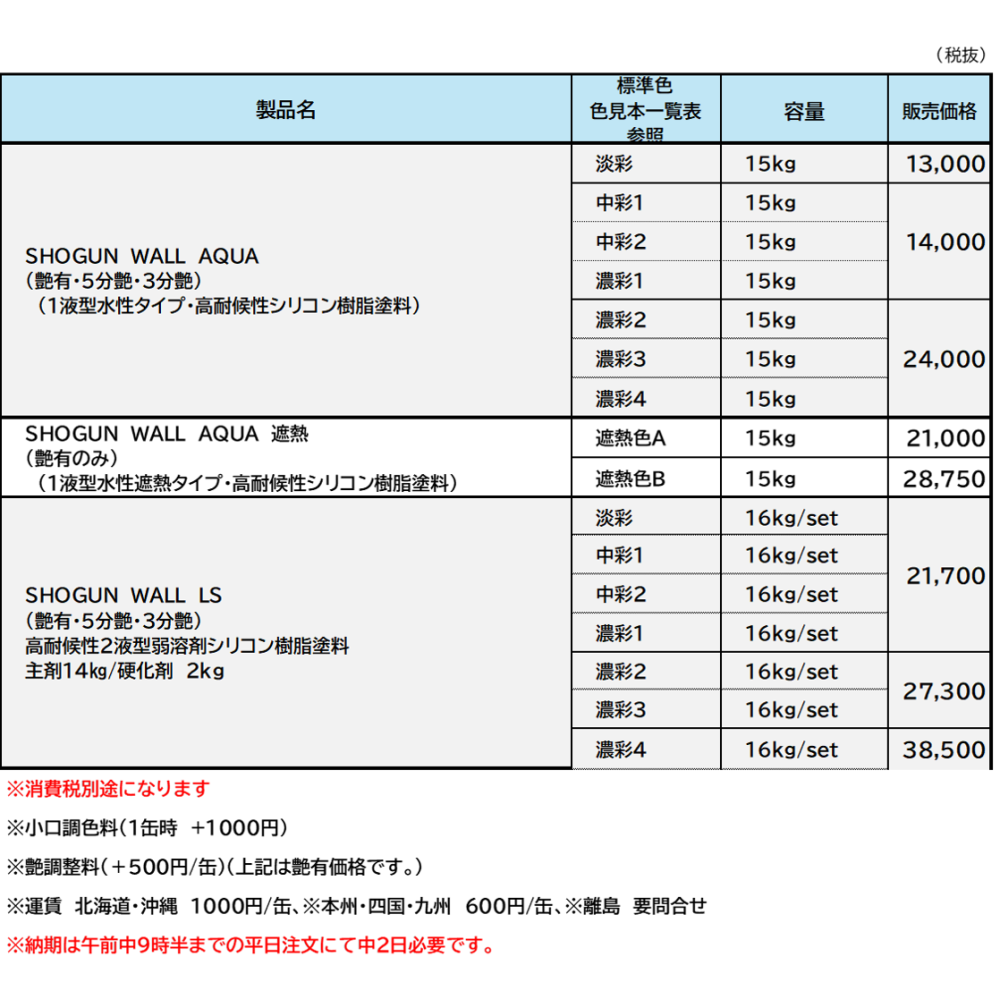 ※3分艶、5分艶の場合、艶調整手数料として+500円(税別)/缶を頂戴しております。